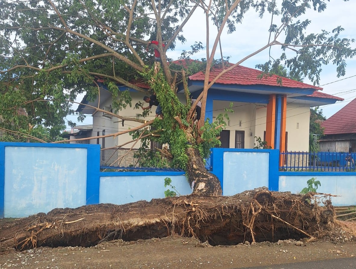 Selain menimpa atap bagian depan rumah dinas, batang pohon besar ini turut menimpa pagar dan kabel listrik milik PLN. Juga tampak terlihat lubang besar di bahu jalan dari bekas akar pohon yang terangkat saat peristiwa ini terjadi.