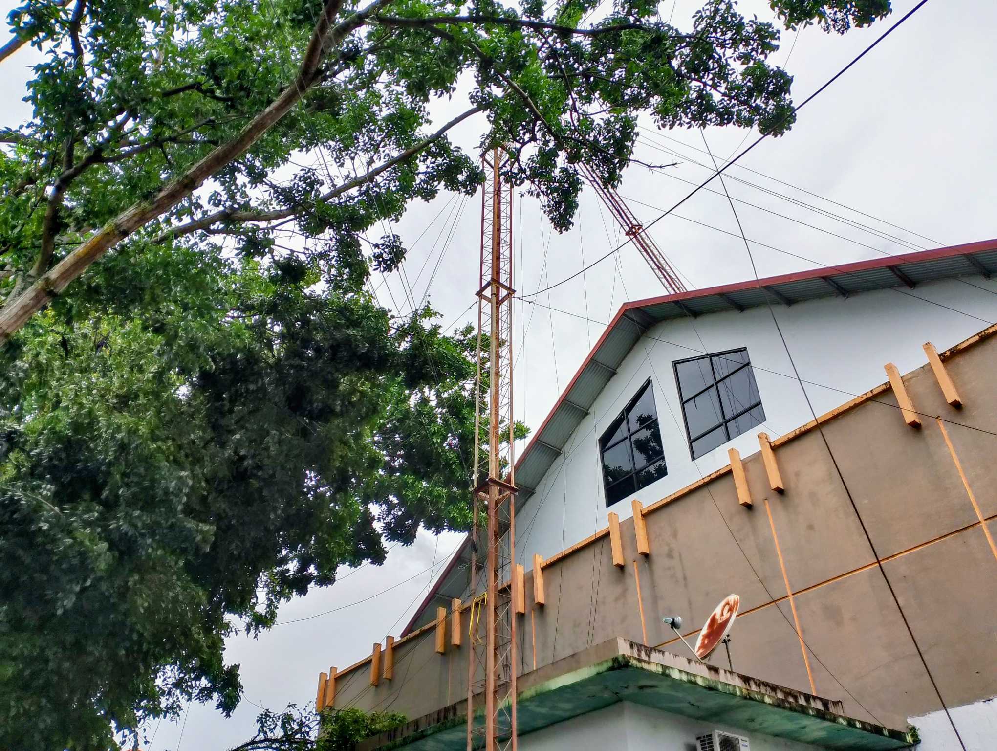 Tower tersebut jatuh dan patah dua setelah ditimpa batang pohon tumbang di Jl. Garuda atau dari arah samping kiri auditorium.