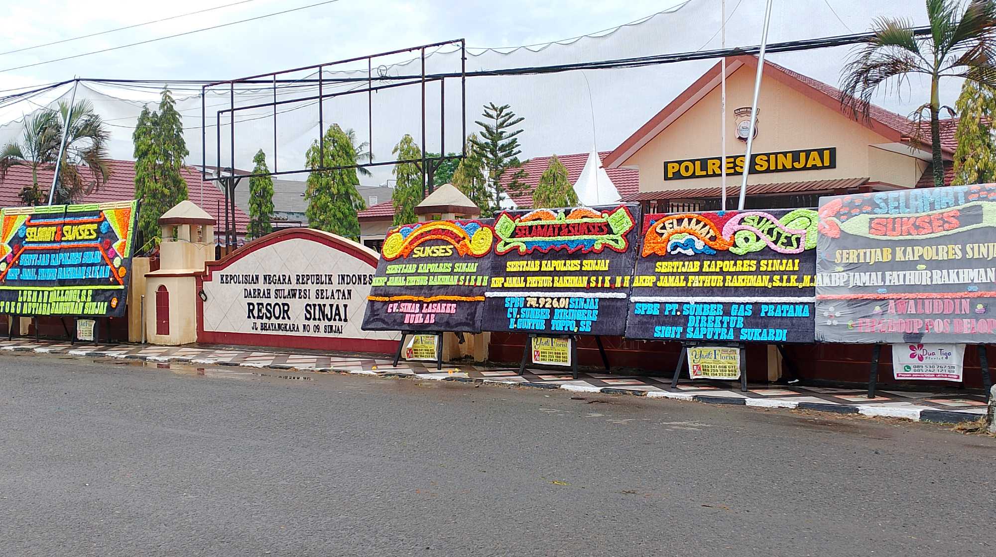 Pantauan di lokasi Selasa (20/1/2026) pagi, puluhan karangan bunga berisi ucapan terima kasih kepada AKBP Harry Azhar serta ucapan selamat datang kepada AKBP Jamal Fathur Rakhman terpasang rapi mulai dari perempatan Jalan Bhayangkara–Jalan Jenderal Sudirman hingga tepat di depan Markas Polres Sinjai.