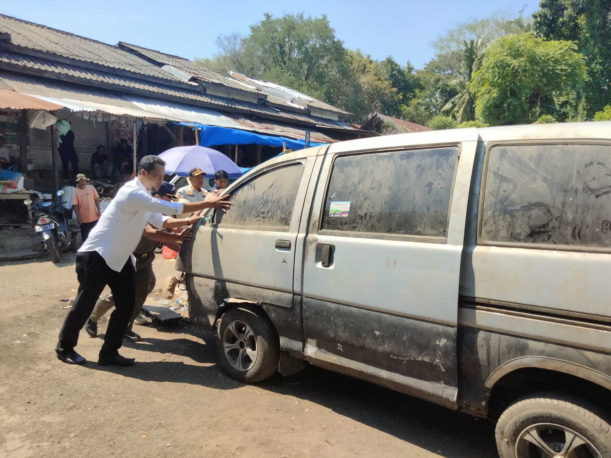 Tampak pula terlihat sebuah mobil rusak yang terparkir di area pasar juga disingkirkan. Diketahui pemilik mobil tersebut adalah salah satu pedagang barang campuran.